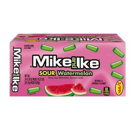 Love sour fruit chews? You ll love Sour Watermelon by Mike and Ike. Just Born a family-owned candy manufacturer has been in business since 1923. They make some of the most beloved and iconic candy brands including MIKE AND IKE Original Fruits chewy assorted fruit flavored candies which were introduced in 1940. Case Contains: 24 .78-oz. boxes Kosher Certified Parve Gluten Free Fat Free Made in the USA Follow All City Candyon Social Media: Facebook|Instagram|YouTube|Pinterest Nutrition Ingredients: Sugar corn syrup modified food starch fruit juice from concentrate (pear orange strawberry cherry lime lemon) contains less than 2% of the following: citric acid malic acid fumaric acid sodium citrate natural and artificial flavors dextrin confectioner s glaze carnauba wax medium chain triglycerides red 40 blue 1 yellow 5 (tartrazine). Ingredients and nutritional information provided by manufacturer and considered accurate at time of posting. Refer to produce labeling or contact manufacturer di
